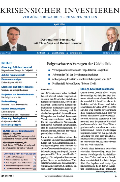 Lesen Sie in der aktuellen April 2026-Ausgabe von KRISENSICHER INVESTIEREN „Folgenschweres Versagen der Geldpolitik“:
