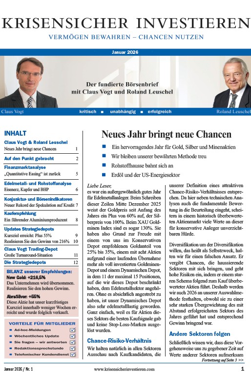 Lesen Sie in der aktuellen Januar 2026-Ausgabe von KRISENSICHER INVESTIEREN „Neues Jahr bringt neue Chancen“: